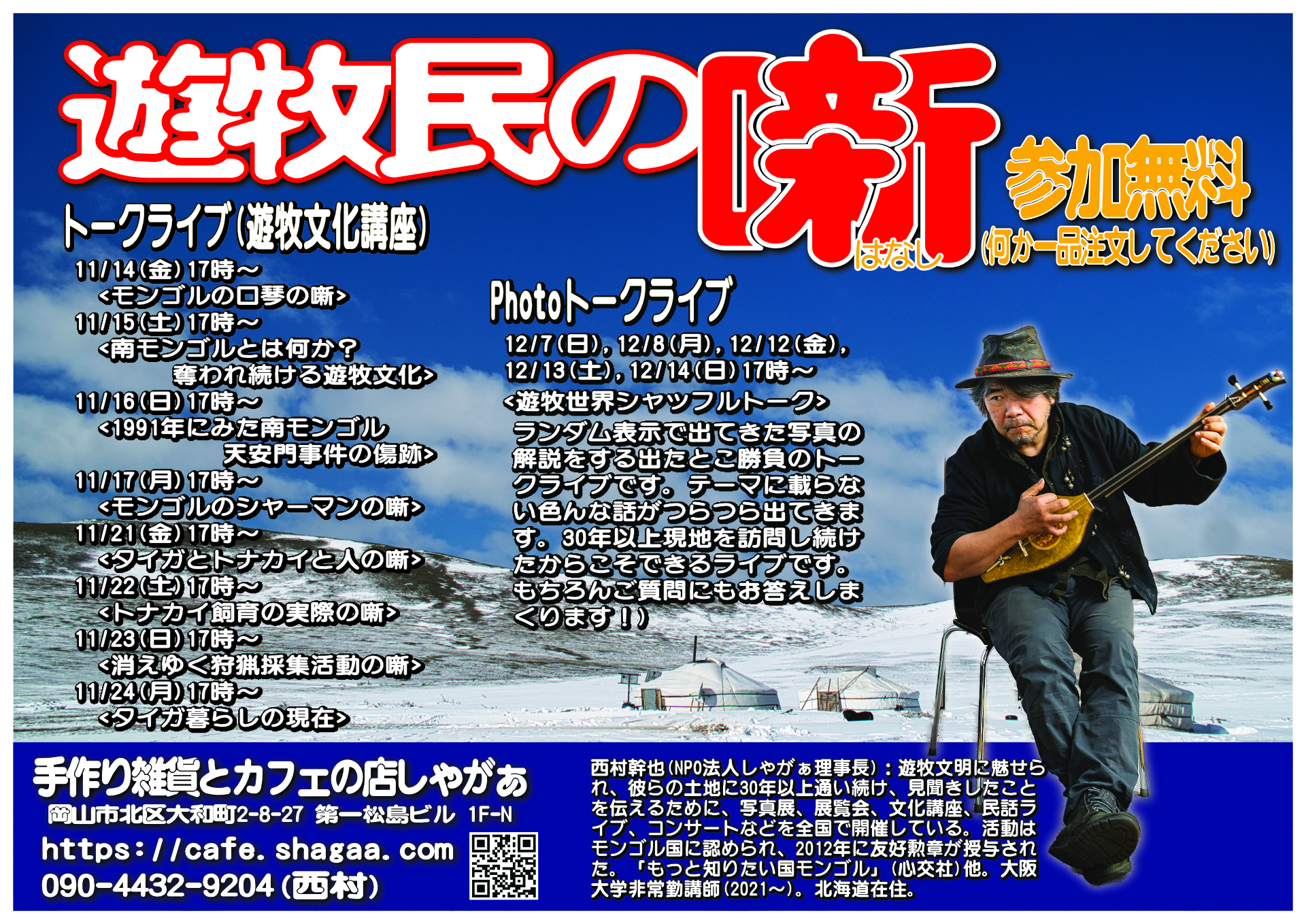 11月、12月とお店ではトークイベント目白押しです! いずれのイベントも参加無料ですが、お店のメニューから一品ご注文ください <トークライブ(遊牧文化講座)>講座といっても堅苦しいことなく、わかりやすくお話し […]