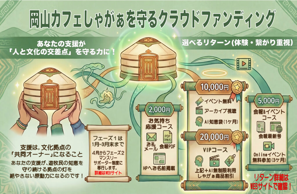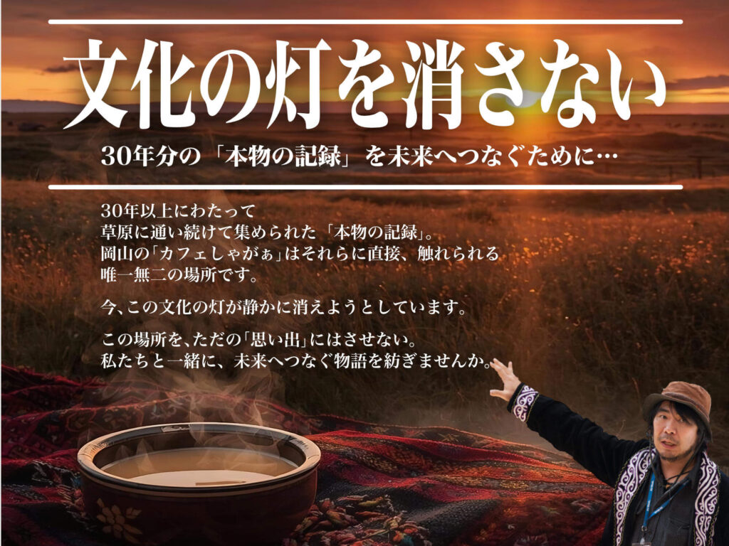 しかし今、カフェしゃがぁは存続の岐路に立っています。 場所を維持するための毎月の固定費の重圧、夏にはモンゴル、冬~春はイベントツアーなどで店を開けられないなど、個人の頑張りだけで支えるのは、正直に申し上げてもう限界です。