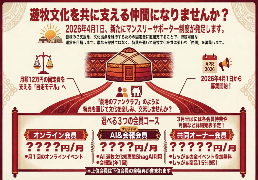 その決意のもと、私は今回、皆様に支援をお願いすることに決めました。 これは単なる寄付のお願いではありません。遊牧世界の知恵を伝え、守る拠点の灯を、未来へつなぐための原動力となる「共同オーナー」になっていただきたいのです。