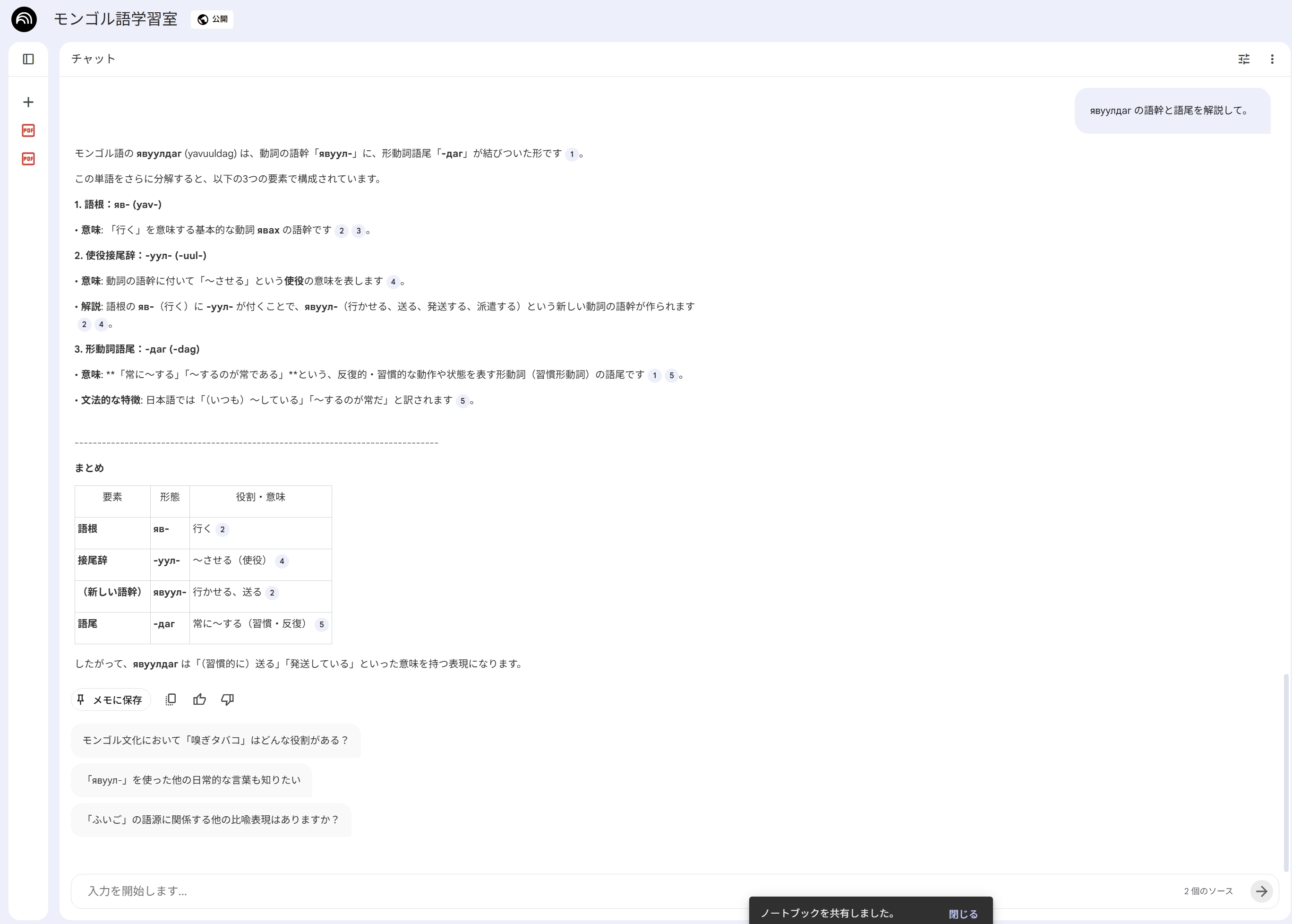 NotebookLM(ブラウザやアプリで使えます)にモンゴル語四週間と小沢先生のモンゴル語日本語辞書を読み込ませただけですが、独習するのにとても便利です。
