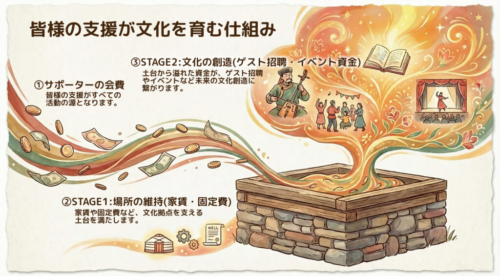 これまで私たちは、その都度のイベント収益や寄付に頼ってきましたが、それでは不安定で「継続的な文化発信」が困難でした。 そこでPhase 2からは、皆様からの毎月の会費を家賃などの固定費に充てることで、安定して文化を育める「自走モデル(マンスリーサポーター制度)」へと移行します。