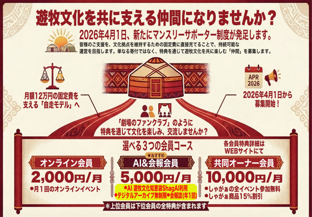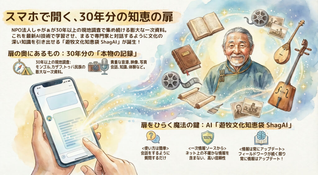 Phase 2の最大の挑戦は、最新技術との融合です。 私たちが蓄積してきた膨大な現地記録(録音、映像、文献)をAIに学習させた「遊牧文化知恵袋 ShagAI(シャガイ)」(Googleの最新AI技術を活用)を提供します。会報しゃがぁ記事、西村の著作、論文、研究ノート、文化講座や各種講演、ライブトークなどの内容全てが蓄積され、それを縦横に検索、まとめて、質問に答えます。