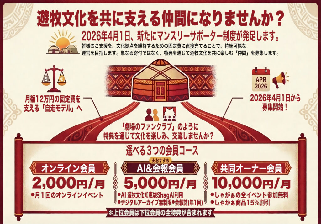 <遊牧文化知恵袋ShagAIは、しゃがぁバックナンバー(~62号:2025年現在)、理事長西村の著作原稿、論文、研究ノート、研究会発表内容、遊牧文化講座、民話ライブなどの各種トークライブ、Podcastなどを詰め込んだNotebookLMを閲覧、利用いただくものです。もちろん、西村が知らないことは…ShagAIも答えられません。あくまでも西村の知識と経験を共有するものです。しかし、一般の検索ではたどり着くことができない知見に触れることが出来るでしょう。>