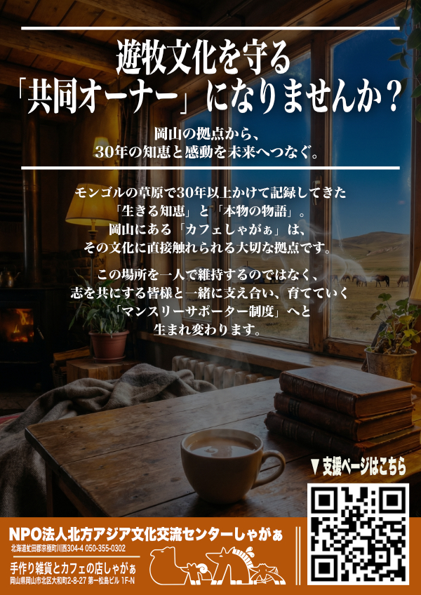 当店の店長、西村幹也は実は、1994年からモンゴルのシャーマンを探しに社会主義体制崩壊直後のモンゴルにわたり、活動を再開したばかりのシャーマンたちを取材して回りました。研究対象として、関わり始めたのですが、素敵なお婆さま […]